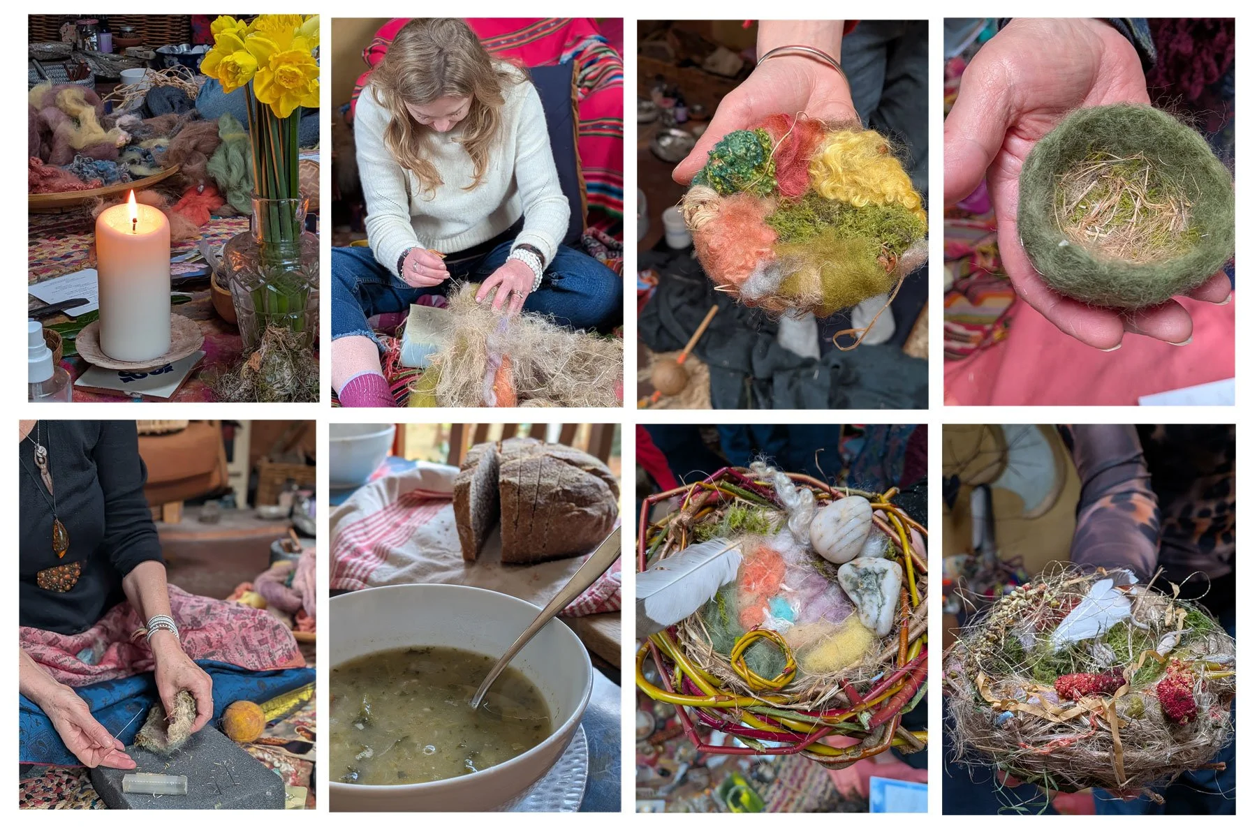 In a beautiful eco lodge on the south downs of England in East Sussex we gathered to celebrate the seasonal threshold of the Spring Equinox, a time of balance, emergence and new life. This was the second gathering for our Year of Seasonal celebrations offering. It is a privilege and joy to work with shamanic practioner, arts counselor and fellow textile artist Ali Rabjohns on these events. The day was held in circle with ceremony, with journeying led by Ali, creativity, seasonal shared food and good company. As the birds begin to make their nests for their young, we too created nests to safely hold our intentions, our seeds at this time of emergence. We had created samples as inspiration from flax tow, mud, woven willow, bramble and raffia and combined these with soft wool fleece, thread and moss. I love how each person intuitively created their own individual nests to anchor what was emerging for them. This way of making invites exploration of materials to fashion something of meaning as a container and a reminder of what we are wanting to bring forth. We were sustained with nourishing nettle soup fro the land and herb teas, plus a delicious cake made by Christine. It was a beautiful day.